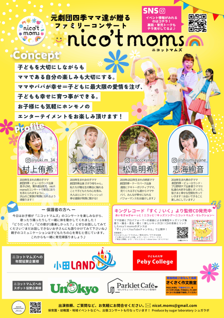 ニコットマムズは、全員が劇団四季出身のママたちによるファミリーエンターテイメントチームです。