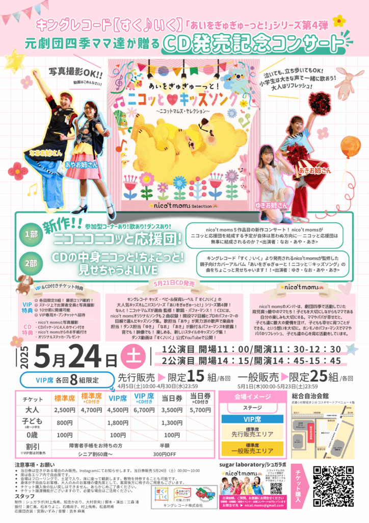 | 2025年 | キングレコード「すく♪いく」レーベルより、 『あいをぎゅぎゅーっと!ニコっと♡キッズソング ニコットマムズセレクション』CD発売予定。 より多くの家庭に“笑顔と音楽”を届ける活動へと広がっている。 |